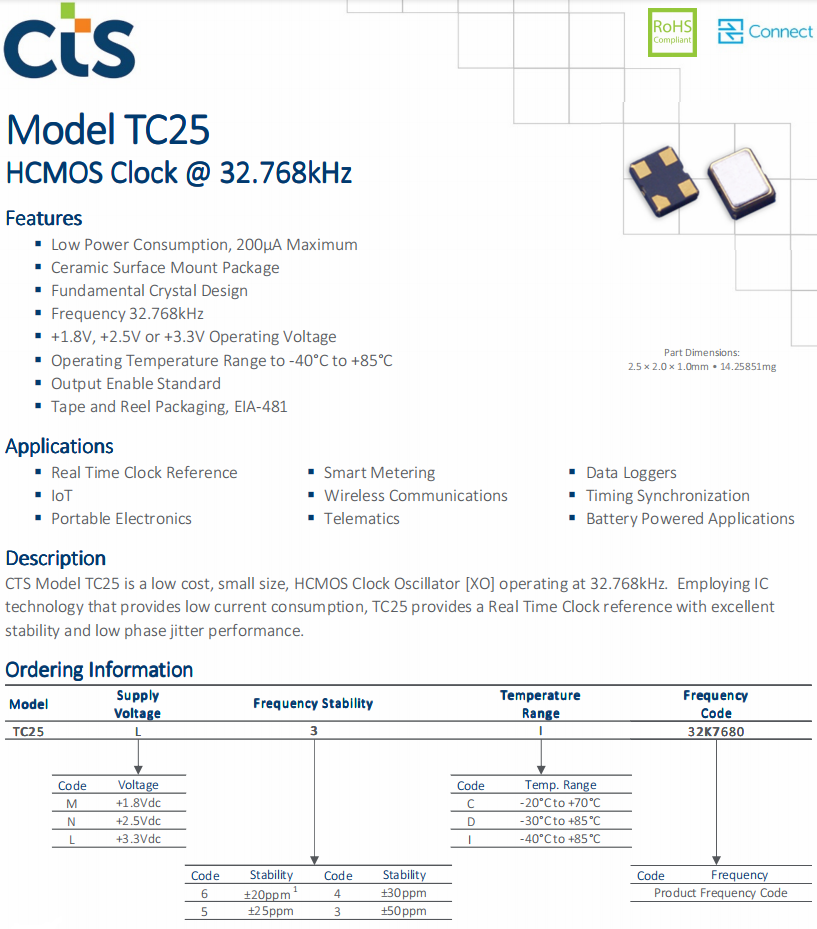 | TC25L3I32K7680 | CTS晶振 | TC25 | 32.768kHz | ±50ppm | 貼片晶振 |