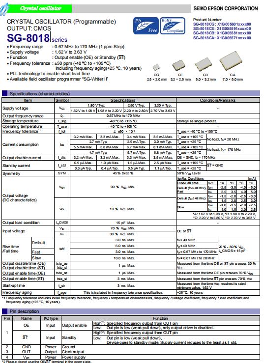 | X1G005601020500 | SG-8018CG | 4.000000 MHz | 2.50 x 2.00 x 0.80 mm | CMOS | 1.620 to 3.630 V | -40 to 105 °C | +/-50 ppm |