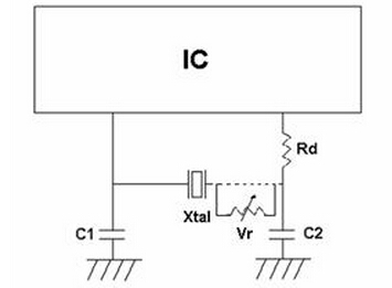 根據頻率,晶體可作為基本或泛音模式.通常,頻率35 MHz以上要求的價格優勢和交貨第三泛音模式.在并行模式下,該晶體在電抗電感,兩個外部電容C1和C2是必要的相移振蕩的要求.Cl和C2需要晶體是否是在基本模式或泛音模式.Cl和C2的值由芯片制造商指定的變化從6pF為47pF.Cl和C2可能不平衡,例如,平等的價值,但有時在一個特定的比例失調(Cl、C2)為了獲得最佳性能,取決于晶體和放大器的特性和電路板布局.(參見圖2)顯示了一個典型的基本操作模式配置.