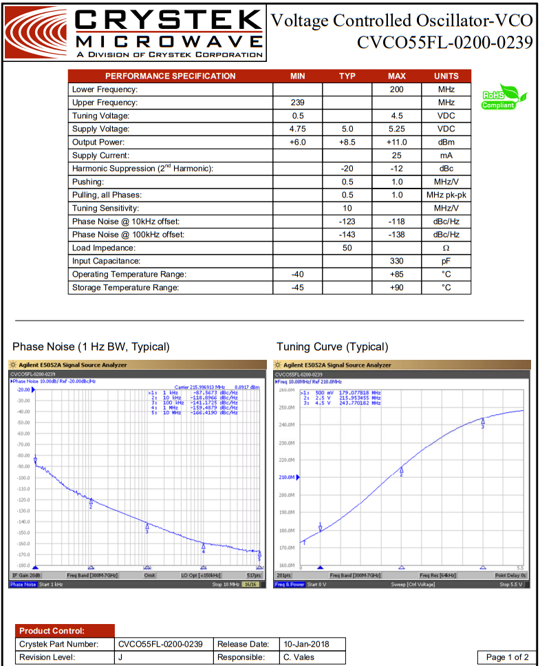 CVCO55FL-0200-0239在美國設計和制造,采用行業標準的0.5 x 0.5英寸SMD封裝。輸入電壓為5v,最大電流消耗為25ma。拉力和推力分別最小化到1.0 MHz pk-pk和1.0 MHz/V。二次諧波抑制典型值為-20 dBc。