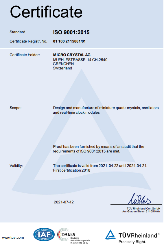 微晶晶振是瑞士Swatch Group Inc .的一家公司,成立于1978年,為Swatch Group的供貨商,提供手表音叉式晶體的產品。而今,微晶已經發展成為一家在微型音叉式石英晶體(32kHz ~ 250MHz)、實時時鐘模塊、振蕩器和OCXOs,無源晶振等多個領域的領先制造商,為世界一流的終端產品應用制造商提供從設計到量產的全方位支持,服務范圍涵蓋可穿戴設備、物聯網、移動電話、消費產品、計算機、汽車電子、手表、工業控制以及醫療植入設備和其他高可靠性產品。