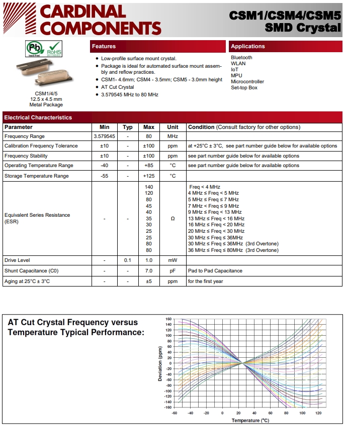 | CSM1Z-A0B2C3-150-4.0D18 | Cardinal晶振 | CRYSTAL 4.0000MHZ 18PF SMD | CSM1 | 4MHz | ±50ppm | -10°C ~ 60°C |