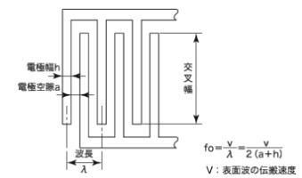 圖一 SAW濾波器的基本結構(橫向型) 圖二 叉指式換能器的基本結構(橫向型)