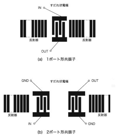 圖三顯示了SAW諧振器的基本結構,通過叉指電極之間產生駐波并增加電極數量,可以實現具有高Q的諧振器。圖四所示,SAW諧振器具有(a)單端口諧振器和(b)雙端口諧振器。單端口型石英晶體諧振器中心簾狀電極與設置在任一側上的結構,以產生駐波的反射器是由叉指電極,諧振器會激勵反射器表面反射的。它主要應用于使用高Q的諧振器和窄帶濾波器。雙端口型諧振器本身是窄帶濾波器結構,將用于所述高Q的振蕩器,高頻帶的窄帶濾波器比單端口型諧振器更優越。