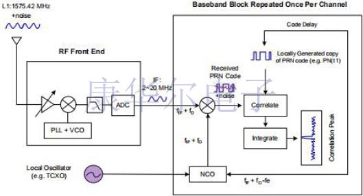 圖2說明了標準的GPS接收器架構(gòu)[2].在RF前端,它包括放大器,濾波器和A-D轉(zhuǎn)換器.天線接收GPS信號和衛(wèi)星產(chǎn)生的噪聲,然后RF前端通過混頻器,濾波器和A-D轉(zhuǎn)換器將RF信號從RF傳輸?shù)絀F(中頻).根據(jù)接收機設(shè)計,中頻通常在2-20MHz的范圍內(nèi).